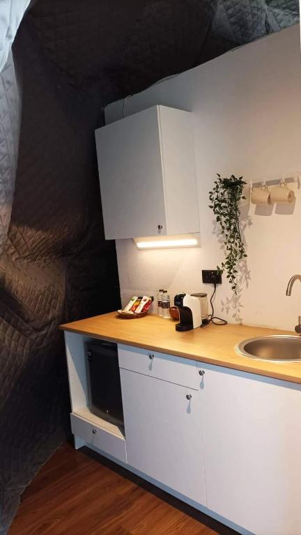 • Kitchenette equipped with a fridge and kitchenware